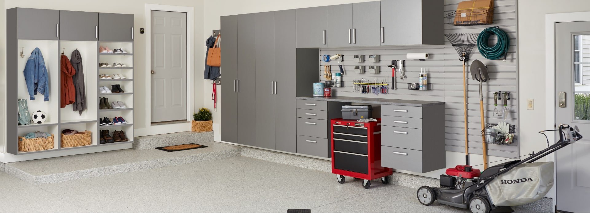 Slatwall panels with hooks, baskets, shelves, and more. These modular systems keep everything organized and within reach.
